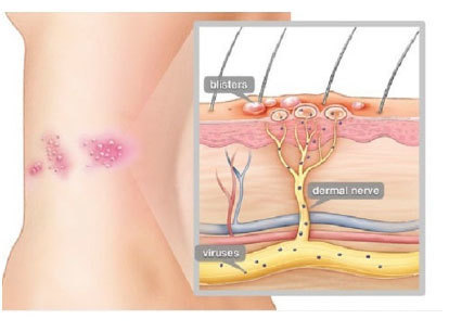 대상포진을 일으키는 바이러스로는 배리셀라 조스터 바이러스로 어린이의 수두를 일으키는 바이러스와 같습니다. 유아기에 수두를 한 번 앓고 나면 면역은 되지만, 이 수두 바이러스가 특정 신경 내에 잠복해 있다가 성인이 되어 인체의 면역력이 약화되면 다시 활동을 하면서 수포성 질환을 일으키게 됩니다.
