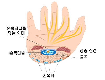 손목터널증후군은 손목뼈들을 가로로 연결하는 인대 아래의 터널 같은 부위로 그 터널 속에 손가락을 구부리고 펴는 힘줄과 손으로 가는 정중신경이 지나가고 있습니다.