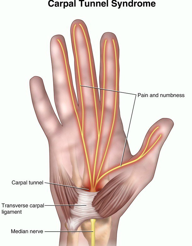 그런데 손을 움직이는 반복적인 직업을 가진 분들은 손목 터널을 둘러싸는 인대나 손목 터널 속의 힘줄이 굵어지게 되고 손목 터널의 공간이 좁아지면서 정중신경이 눌리게 됩니다. 그로 인해 정중신경이 지배하는 부위인 손바닥과 첫째 ~ 넷째 손가락이 저리게 됩니다. 바로 이것이 손목터널 증후군입니다.