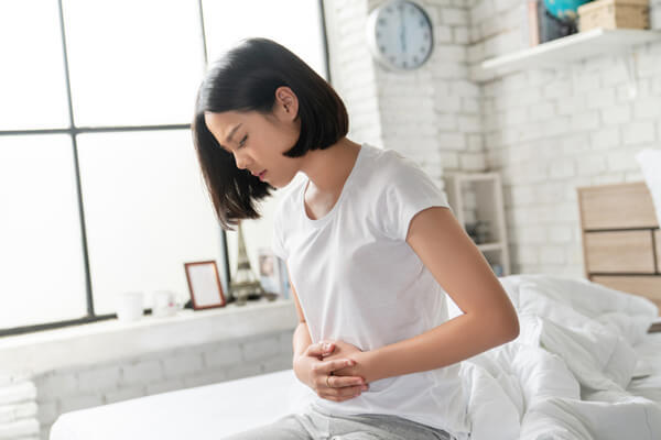복통 때문에 침대에 누워 배를 만지고 있다배가 아픈 여성복통이 심한 여성